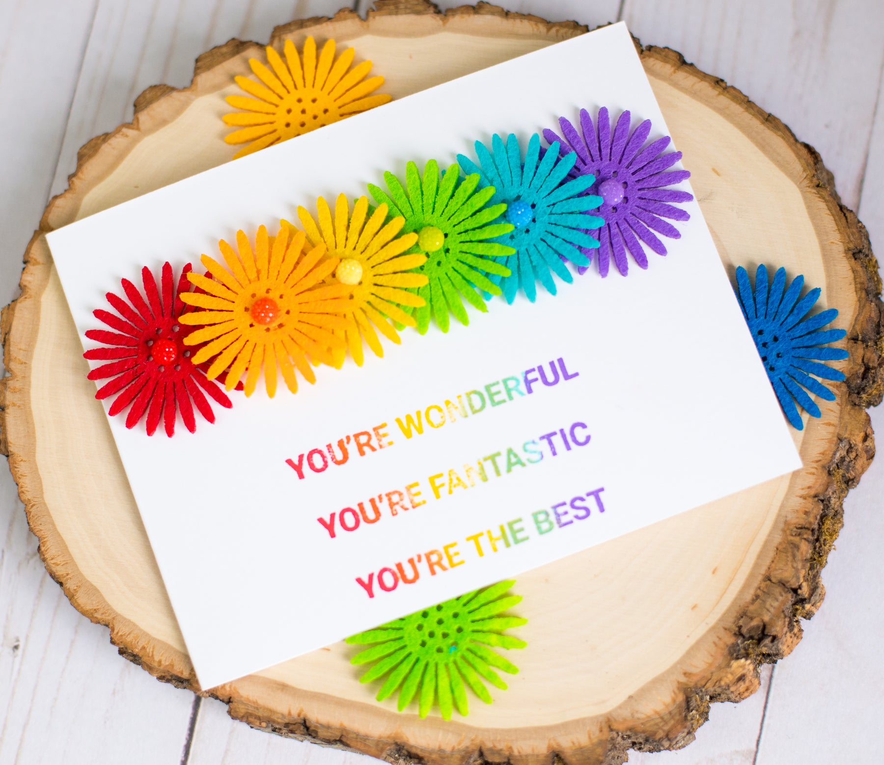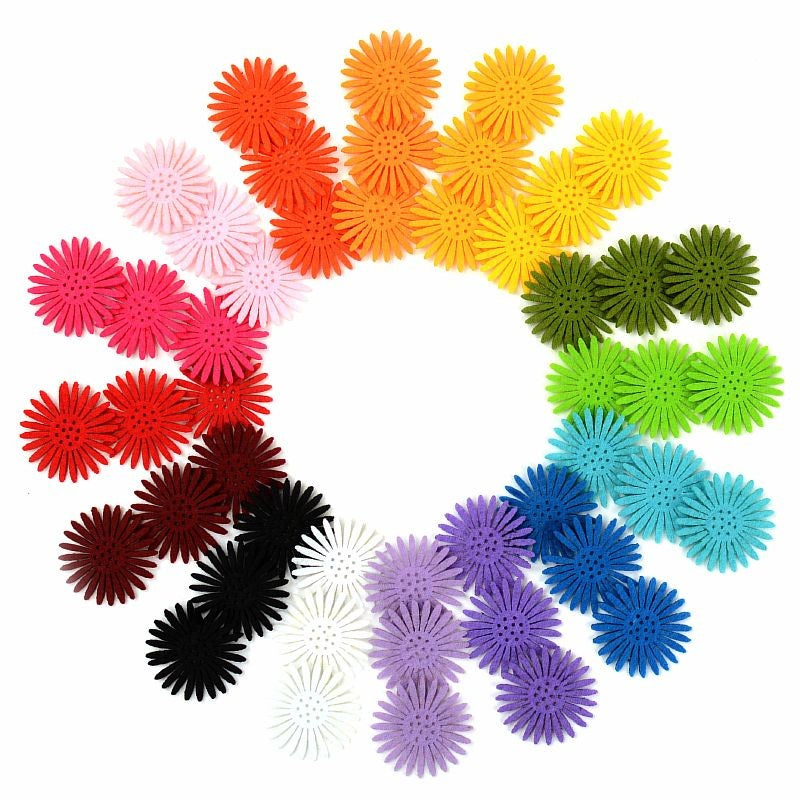 Includes 48 felt daisy flowers in rainbow of colors. Flowers measure approx 3". Limit 2.