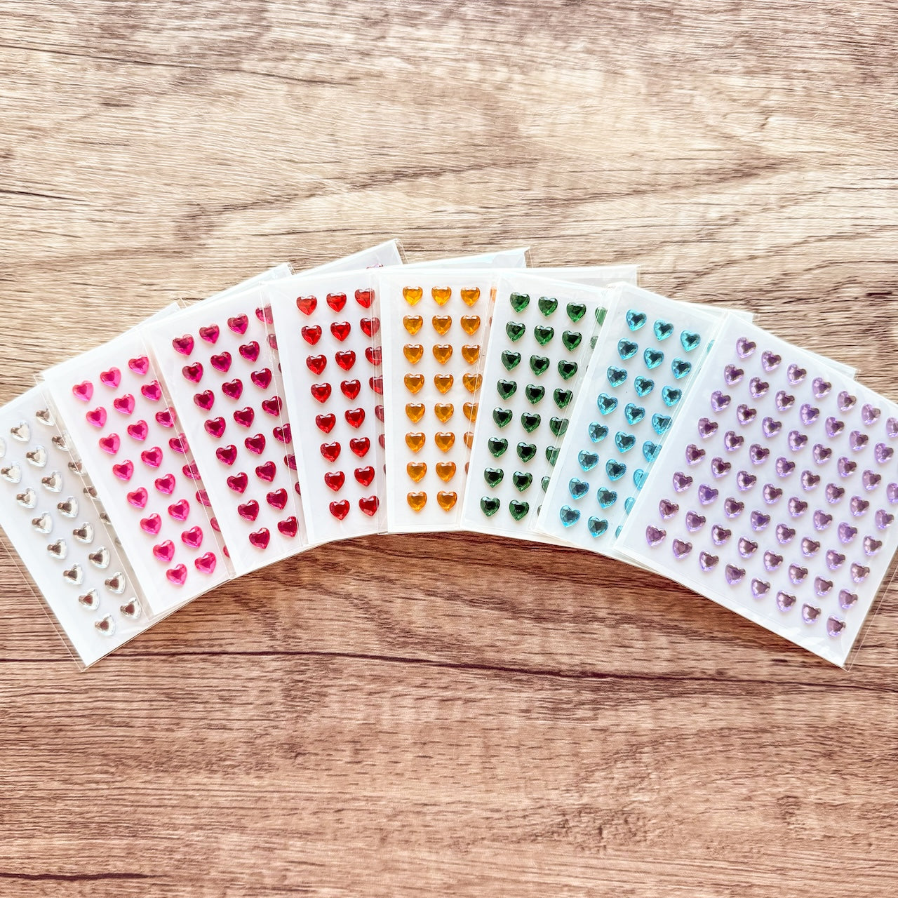 Includes 8 colors of heart rhinestones with self adhesive backing. Over 60 stones per color. Limit 1 per customer.