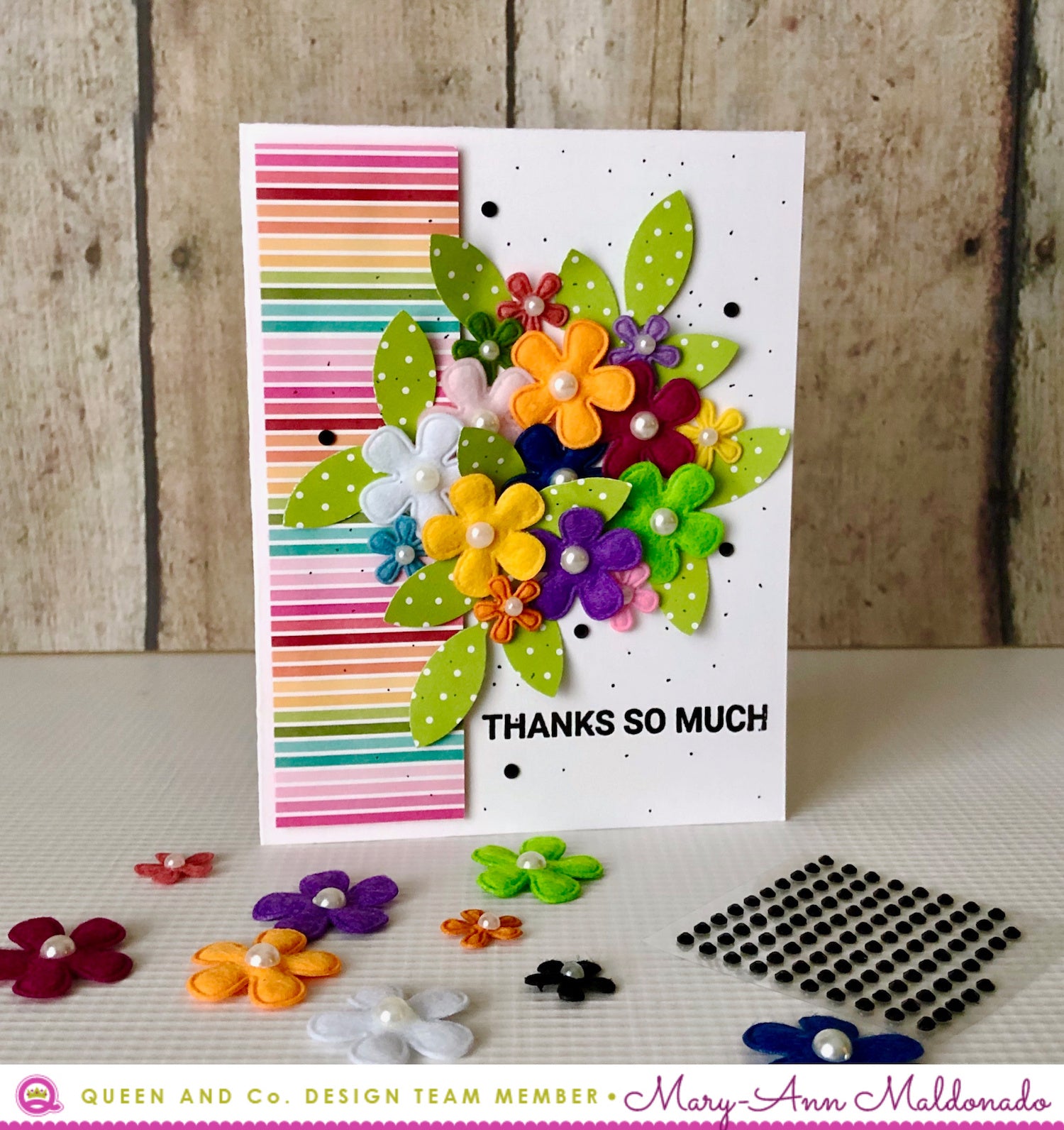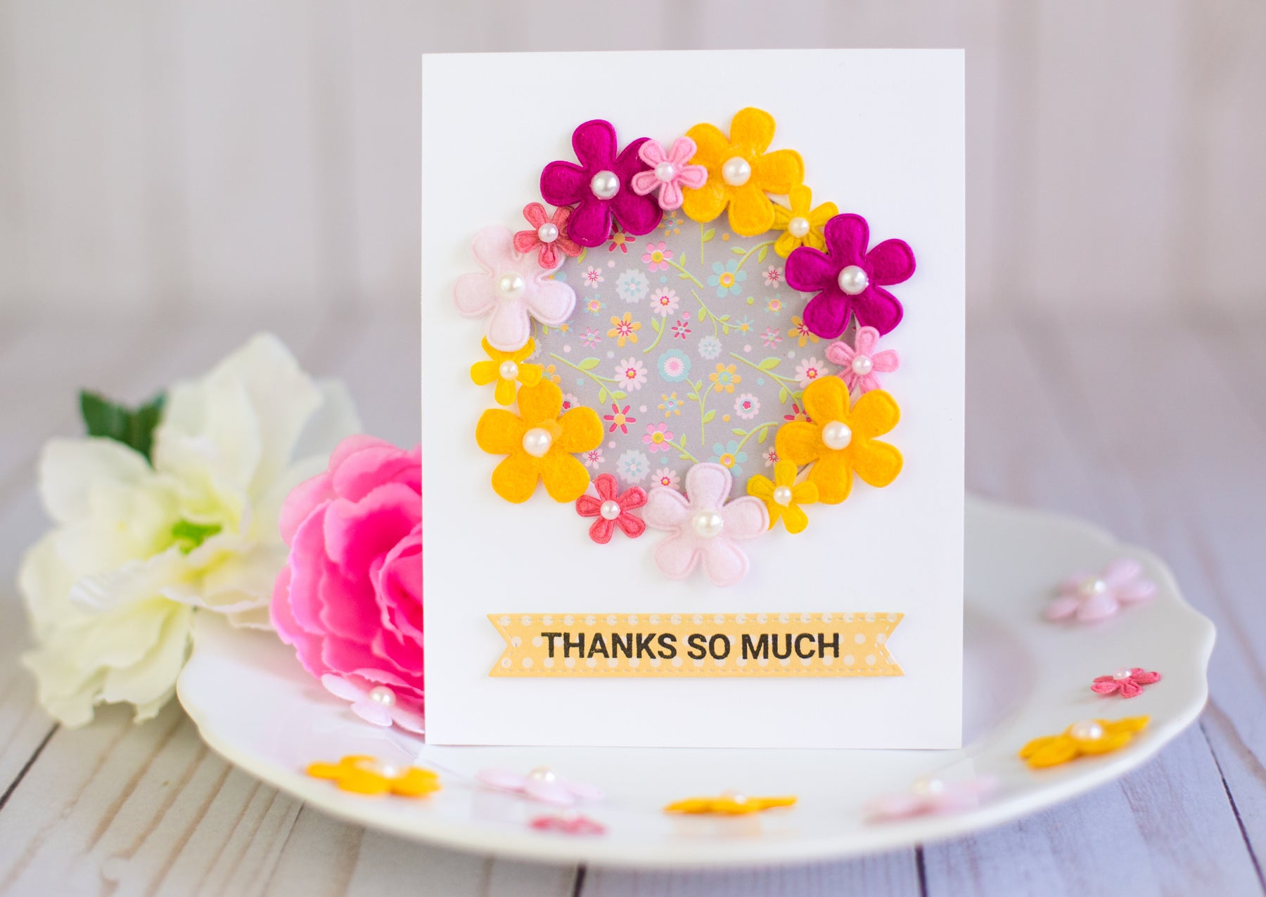 Includes 11 felt flowers with pearl centers in rainbow of 8 colors. Limit 1